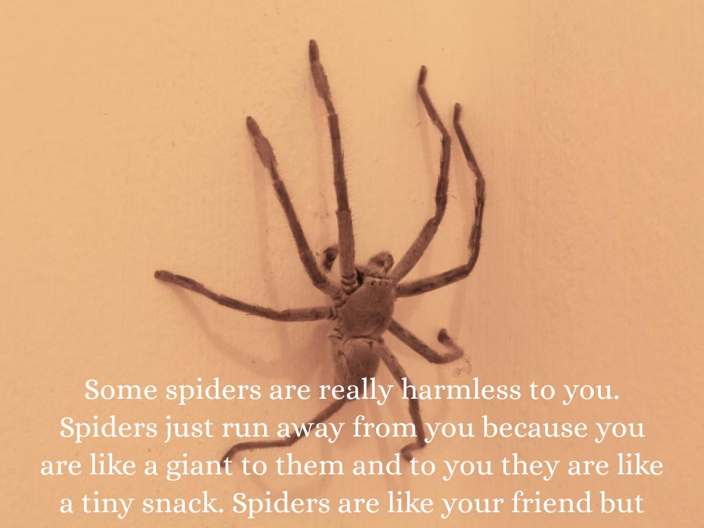 Some spiders are really harmless to you. Spiders just run away from you because you are like a giant to them and to you they are like a tiny snack. Spiders are like your friend but they are like your little brother but 100% smaller. You can actually keep a spider and there are 900 different kinds of spiders. Most spiders are not harmless. You might think there all harmless but no.
