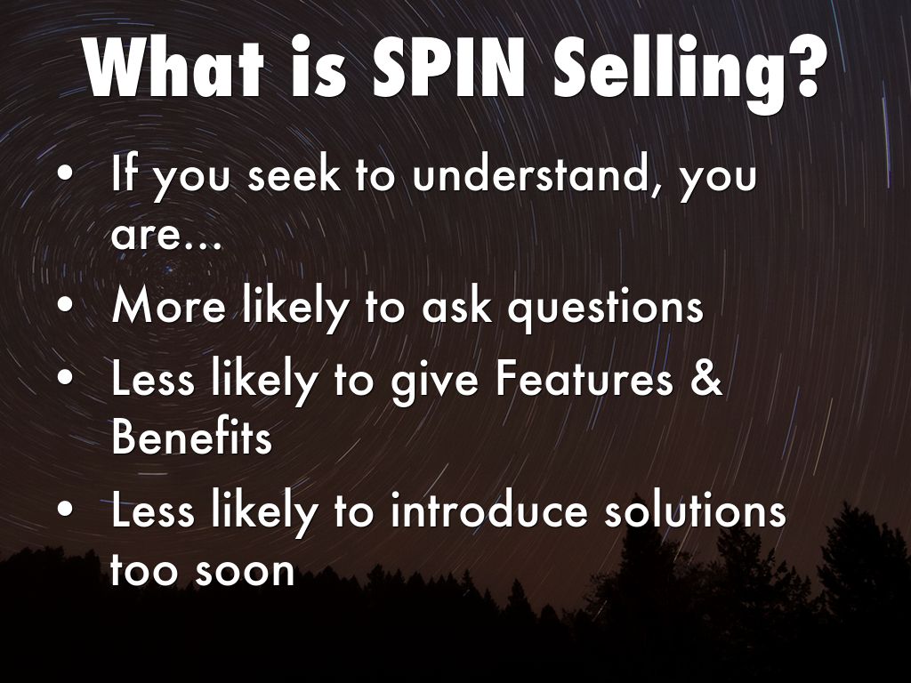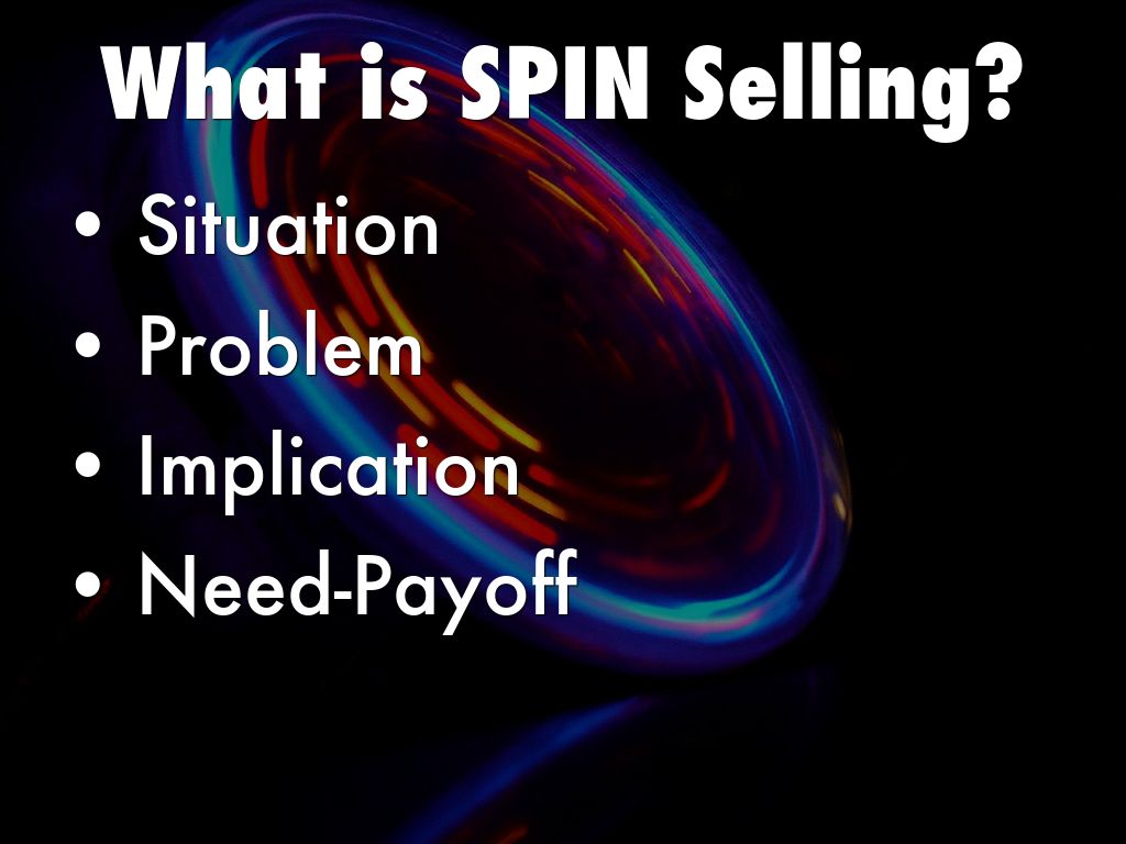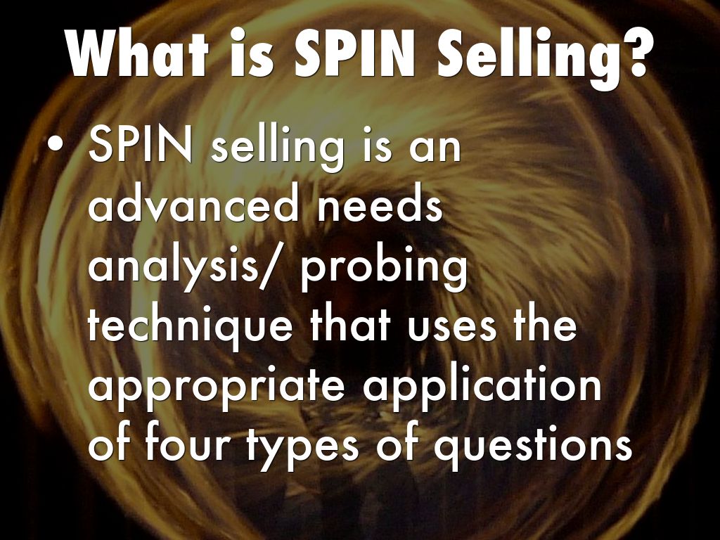 SPIN selling is an advanced needs analysis/ probing technique that uses the appropriate application of four types of questions