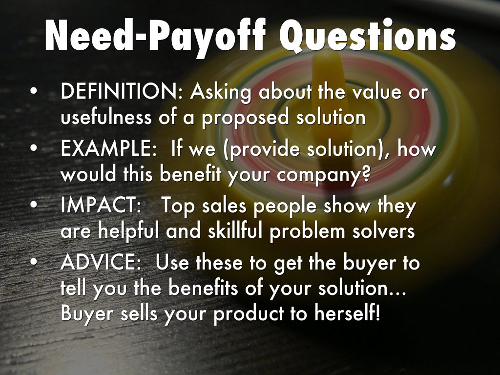 ADVICE: Use these to get the buyer to tell you the benefits of your solution... Buyer sells your product to herself!