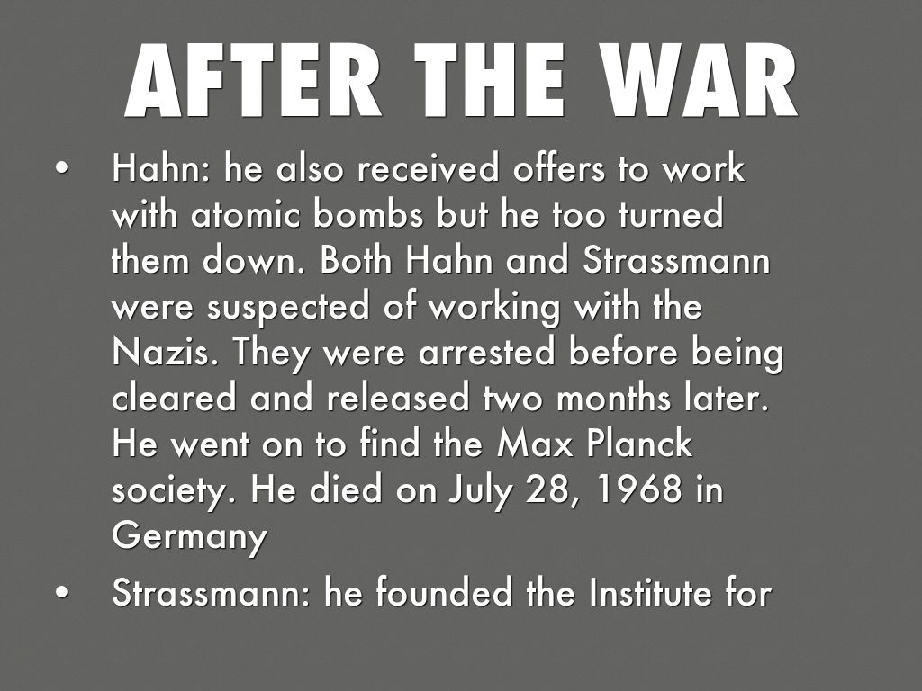 • Hahn: he also received offers to work with atomic bombs but he too turned them down. Both Hahn and Strassmann were suspected of working with the Nazis. They were arrested before being cleared and released two months later. He went on to become the founder of the Max Planck society. He died on July 28, 1968 in Germany form natural causes.