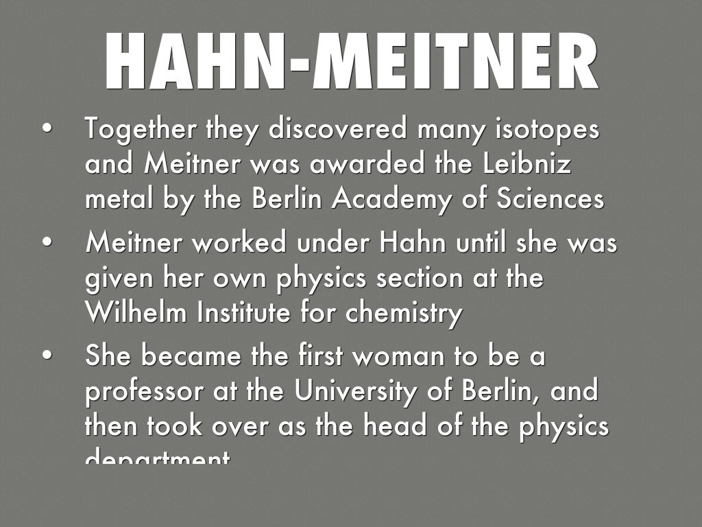 • Together they discovered many isotopes and Meitner was awarded the Leibniz metal by the Berlin Academy of Sciences
