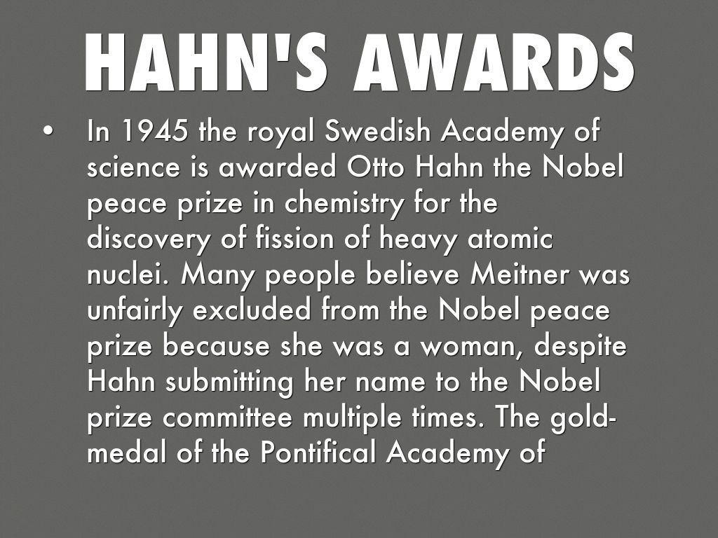 • In 1945, the Royal Swedish Academy of Sciences awarded Otto Hahn the Nobel peace prize in chemistry for the discovery of fission of heavy atomic nuclei. Many people believe Meitner was unfairly excluded from the Nobel peace prize because she was a woman, despite Hahn submitting her name to the Nobel prize committee multiple times. The gold-medal of the Pontifical Academy of science was awarded to him from Pope John the 23rd in 1957. He was elected a foreign member of the royal society in 1957