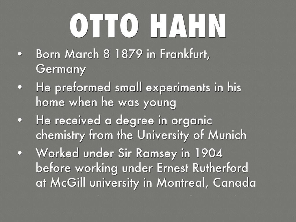 Otto Hahn- (march 8 of 1879-July 28, 1968 ) he was born in Frankfurt, Germany and he had always had a love for chemistry and even carried out small experiments in his home when he was a young boy. He studied chemistry and mineralogy at the University of Marburg, but received his organic chemistry degree at the University of Munich. He served one year in the German military, then worked at the University College London under Sir William Ramsey in 1904. There he discovered Thorium-228. Hahn then worked under Ernest Rutherford at McGill university in Montreal, Canada, where he discovered more isotopes like: polonium-212, lead-210, and thorium-227. He then returned to Germany where he worked with Emil Fischer at the University of Berlin and discovered mesothorium and thorium-230. He then met and began work with Lise Meitner as well as married Edith Junghans.