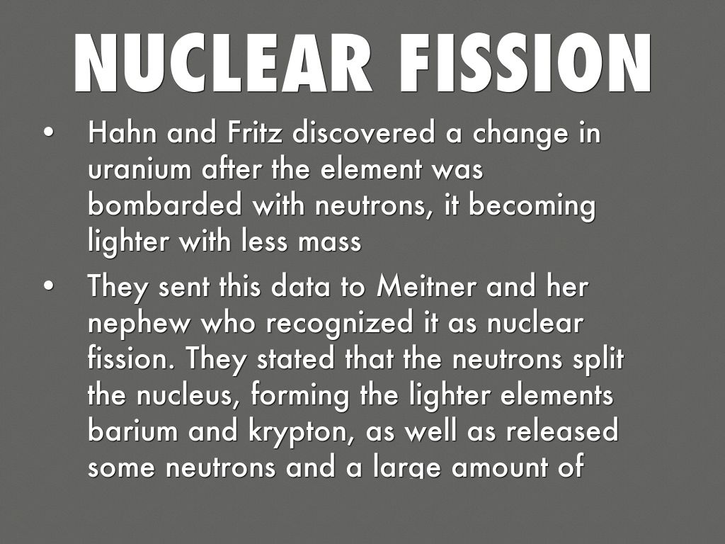 • Hahn and Fritz discovered a change in uranium after the element was bombarded with neutrons, it becoming lighter with much less mass