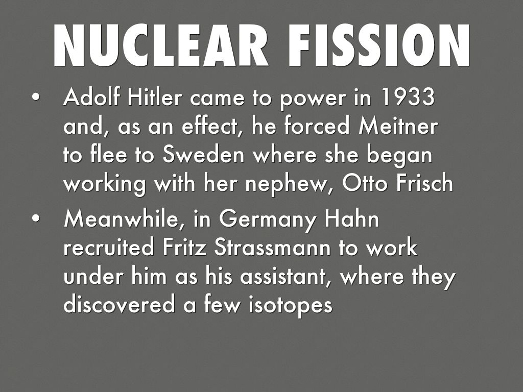 • Adolf Hitler came to power in 1933 and, as an effect, he forced Meitner to flee to Sweden where she began working with her nephew, Otto Frisch
