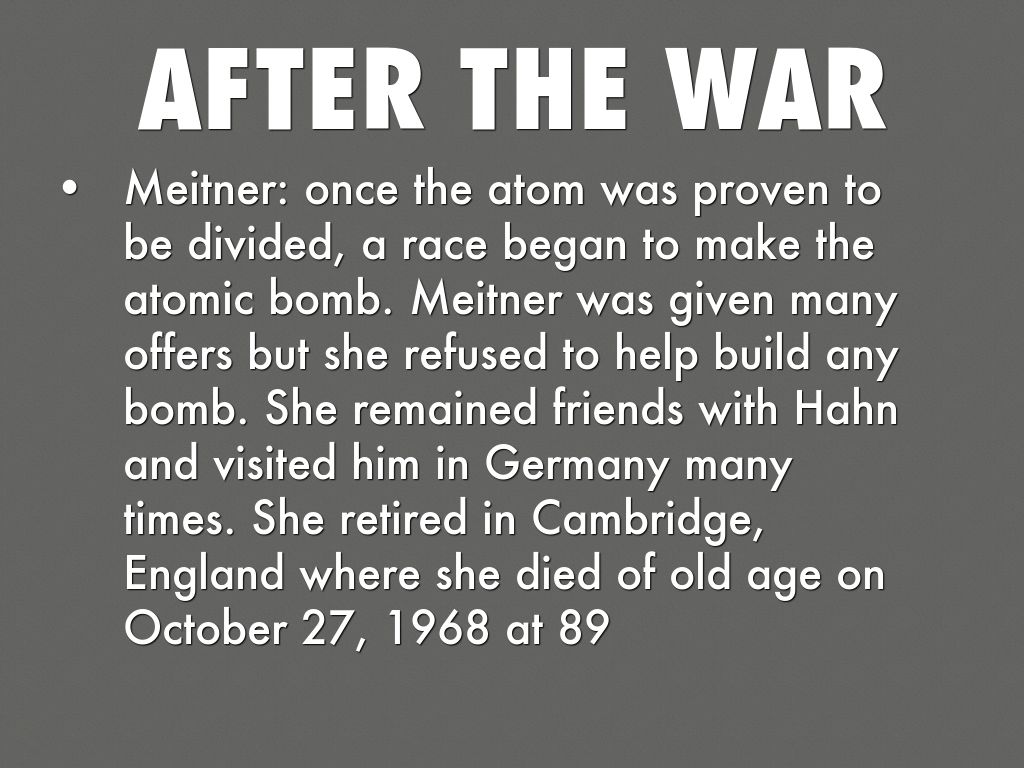 • Meitner: once the atom was proven it could be divided, a race began to make the atomic bomb. Meitner was given many offers but she refused to help build any bomb. She remained friends with Hahn and visited him in Germany many times. She retired in Cambridge, England where she died a heart attack on October 27, 1968 at 89 years old.