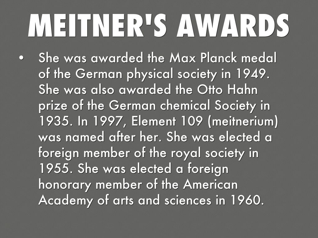 • She was awarded the Max Planck medal of the German physical society in 1949. She was also awarded the Otto Hahn prize of the German Chemical Society in 1935. In 1997, Element 109 (meitnerium) was named after her. She was elected a foreign member of the Royal Society in 1955. She was elected a foreign honorary member of the American Academy of arts and sciences in 1960. Meitner was the first female in the scientific class of the Austrian Academy of Sciences. Meitner, Hahn, and Strassmann were all awarded the Enrico Fermi award.