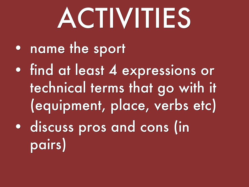 find at least 4 expressions or technical terms that go with it (equipment, place, verbs etc)