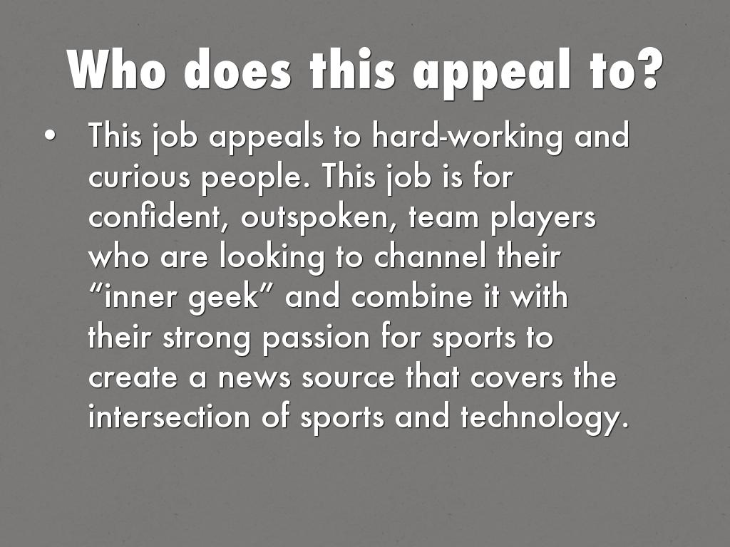 - This job appeals to hard-working and curious people. This job is for confident, outspoken, team players who are looking to channel their “inner geek” and combine it with their strong passion for sports to create a news source that covers the intersection of sports and technology.