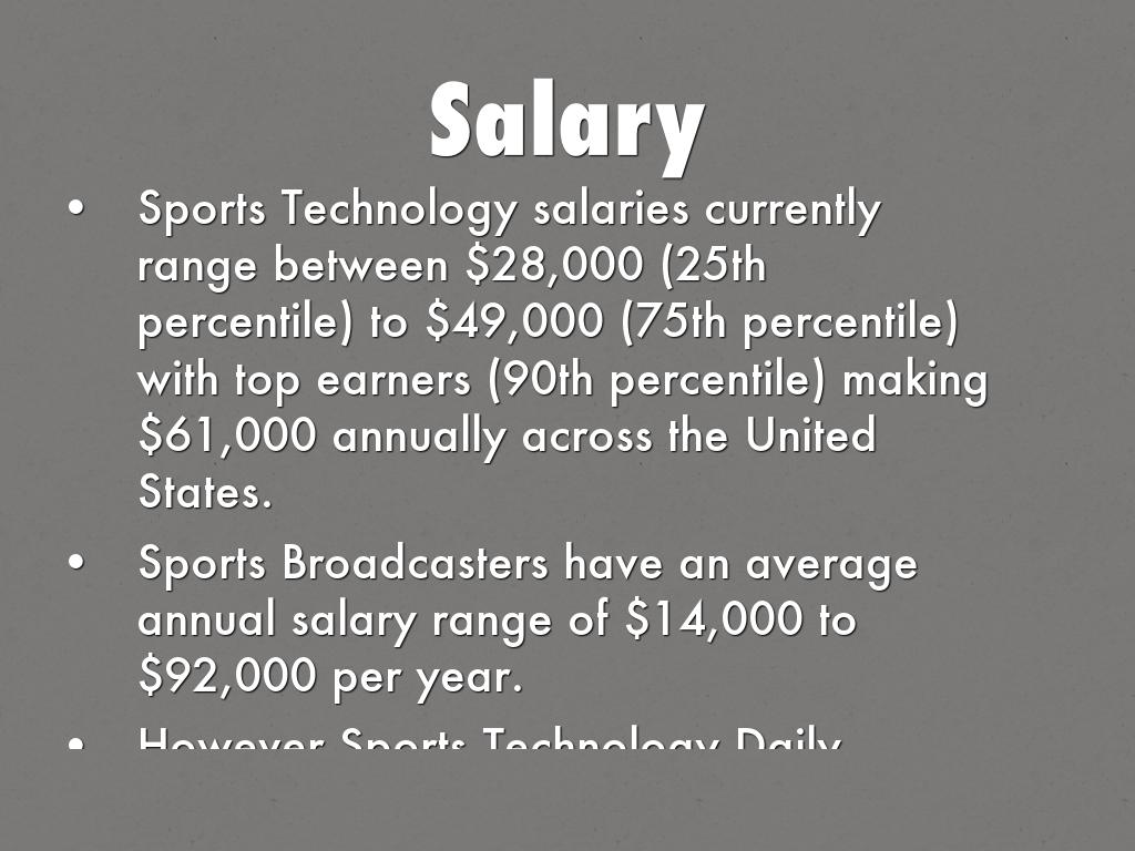 - Sports Technology salaries currently range between $28,000 (25th percentile) to $49,000 (75th percentile) with top earners (90th percentile) making $61,000 annually across the United States.