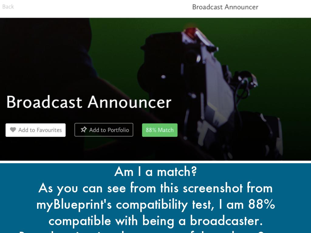 As you can see from this screenshot from myBlueprint's compatibility test, I am 88% compatible with being a broadcaster. Broadcasting is a large part of the role a Sports Technology Daily Journalist plays at companies like SportsTechie for example.