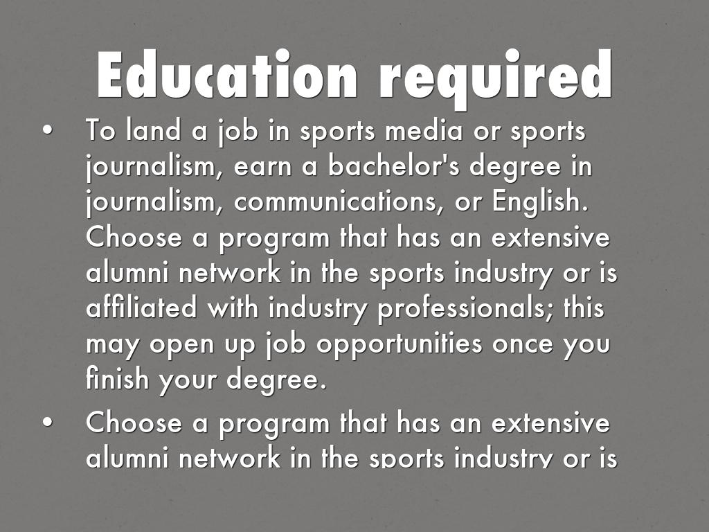 - To land a job in sports media or sports journalism, earn a bachelor's degree in journalism, communications, or English. Choose a program that has an extensive alumni network in the sports industry or is affiliated with industry professionals; this may open up job opportunities once you finish your degree.