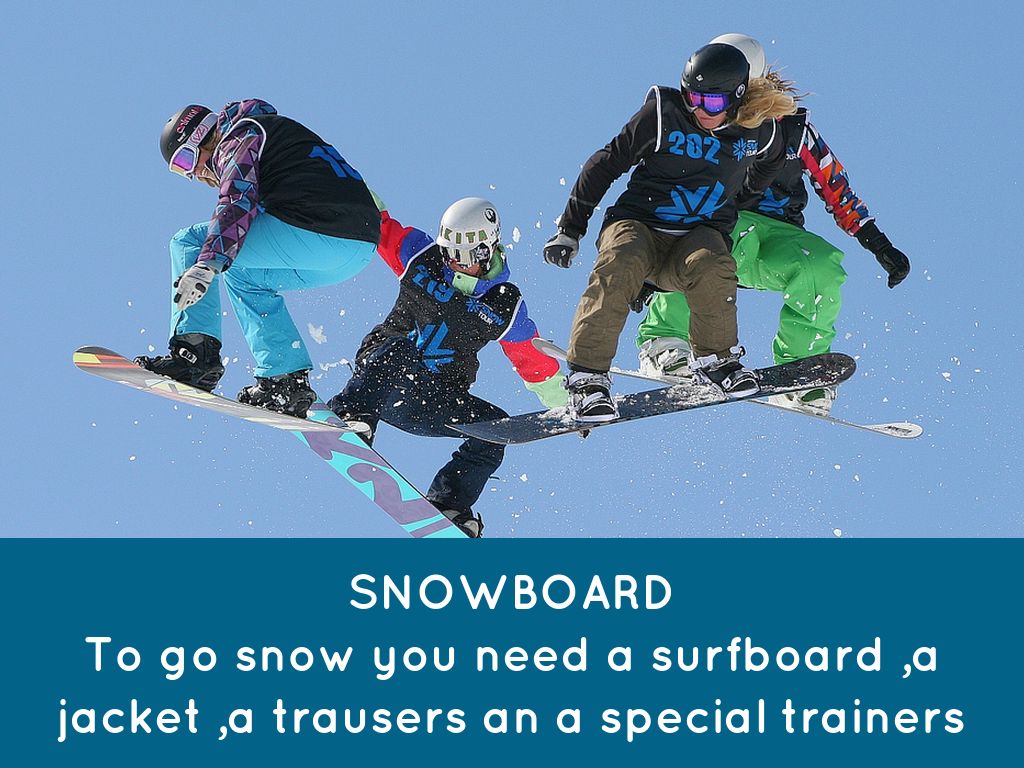 To go snow you need a surfboard ,a jacket ,a trausers an a special trainers