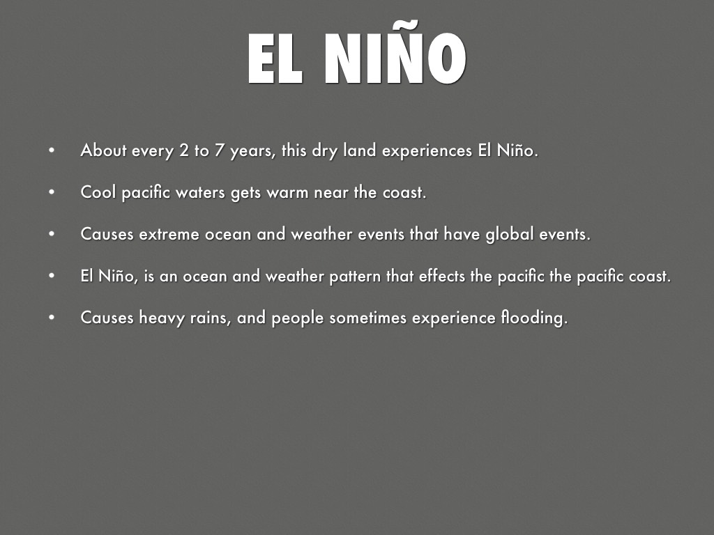 El Niño, is an ocean and weather pattern that effects the pacific the pacific coast.