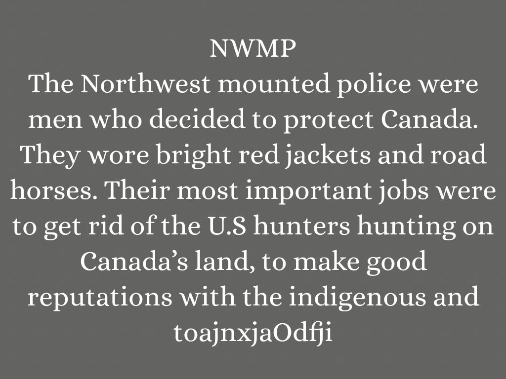 The Northwest mounted police were men who decided to protect Canada. They wore bright red jackets and road horses. Their most important jobs were to get rid of the U.S hunters hunting on Canada’s land, to make good reputations with the indigenous and toajnxjaOdfji
