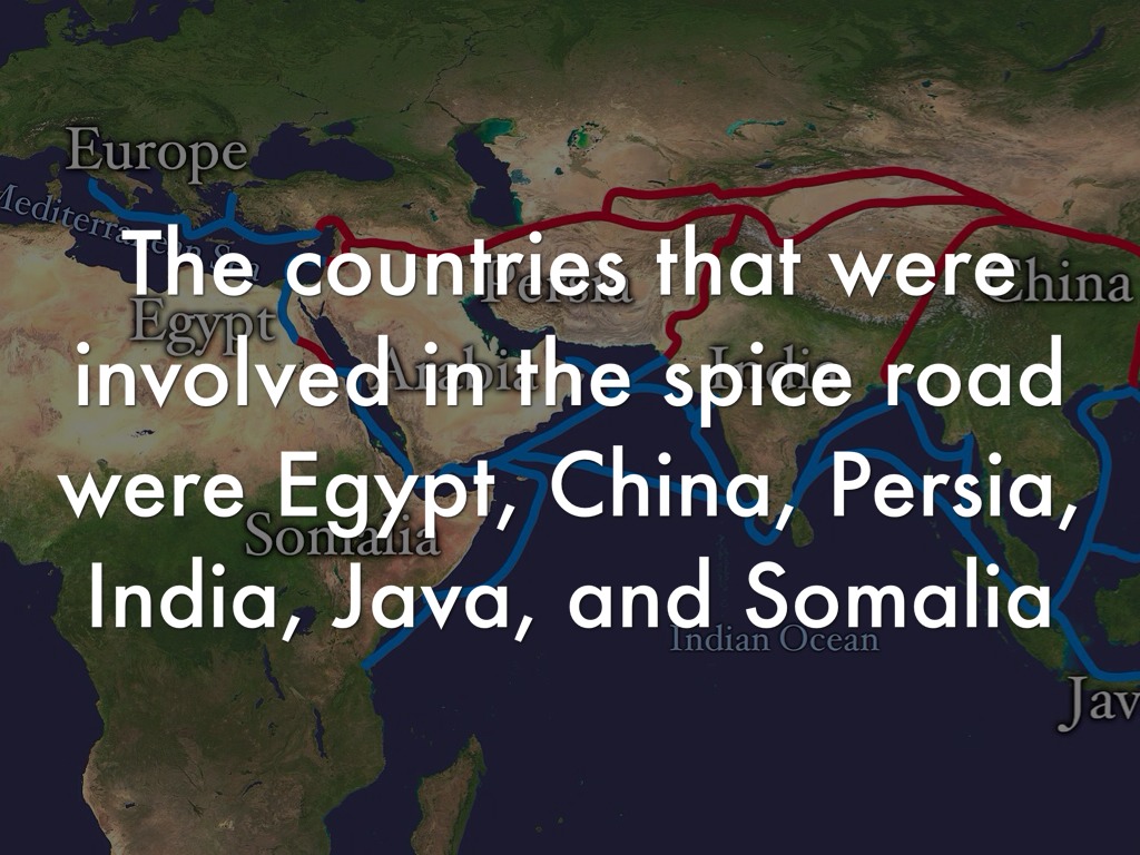 The countries that were involved in the spice road were Egypt, China, Persia, India, Java, and Somalia