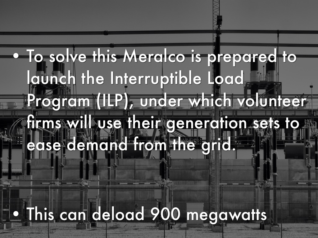 To solve this Meralco is prepared to launch the Interruptible Load Program (ILP), under which volunteer firms will use their generation sets to ease demand from the grid.