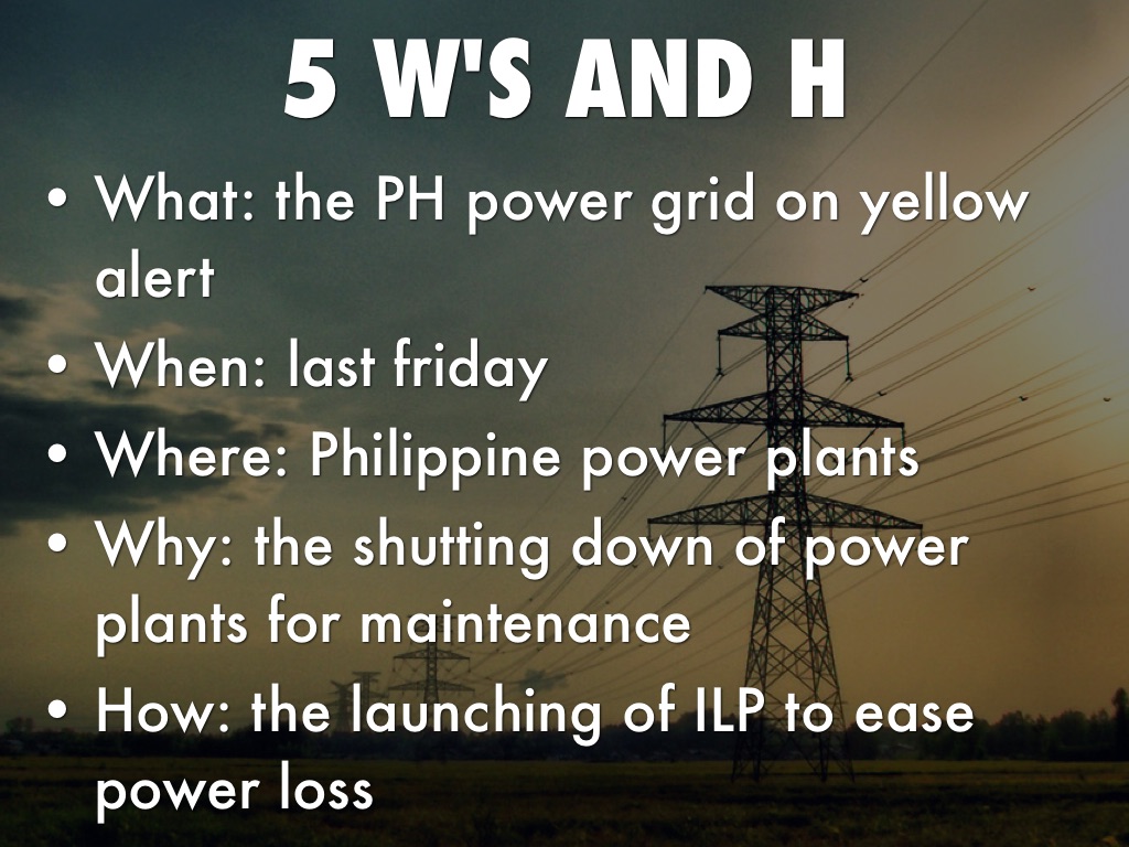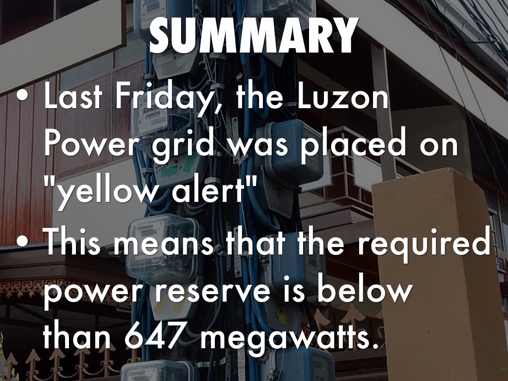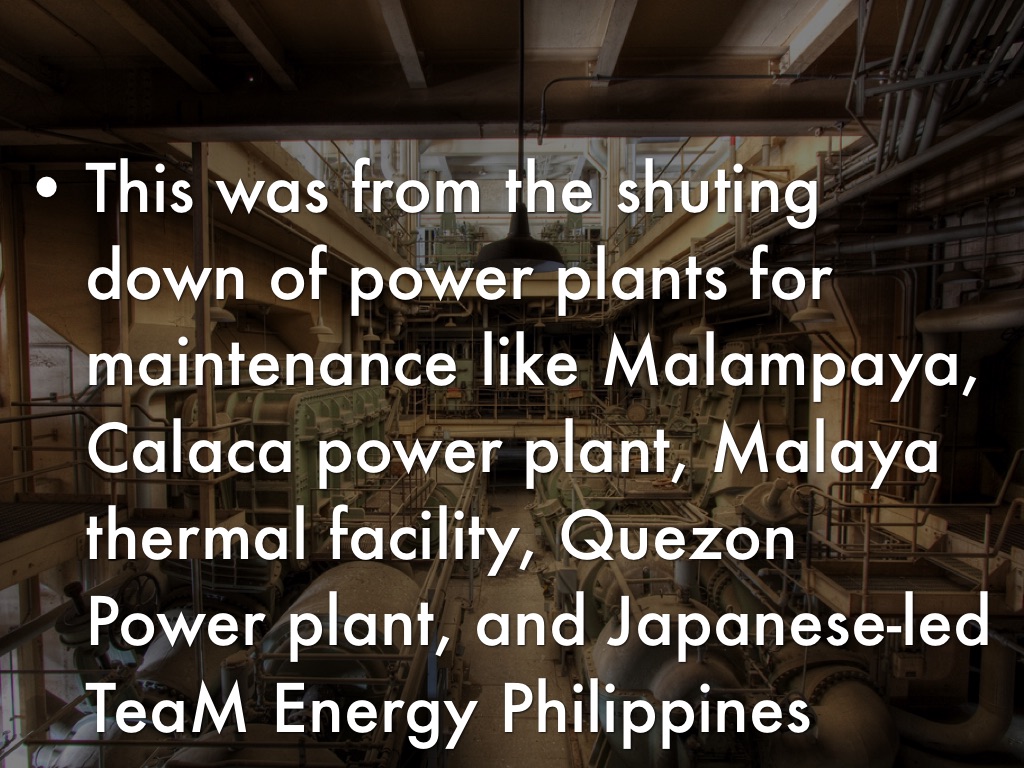 This was from the shuting down of power plants for maintenance like Malampaya, Calaca power plant, Malaya thermal facility, Quezon Power plant, and Japanese-led TeaM Energy Philippines
