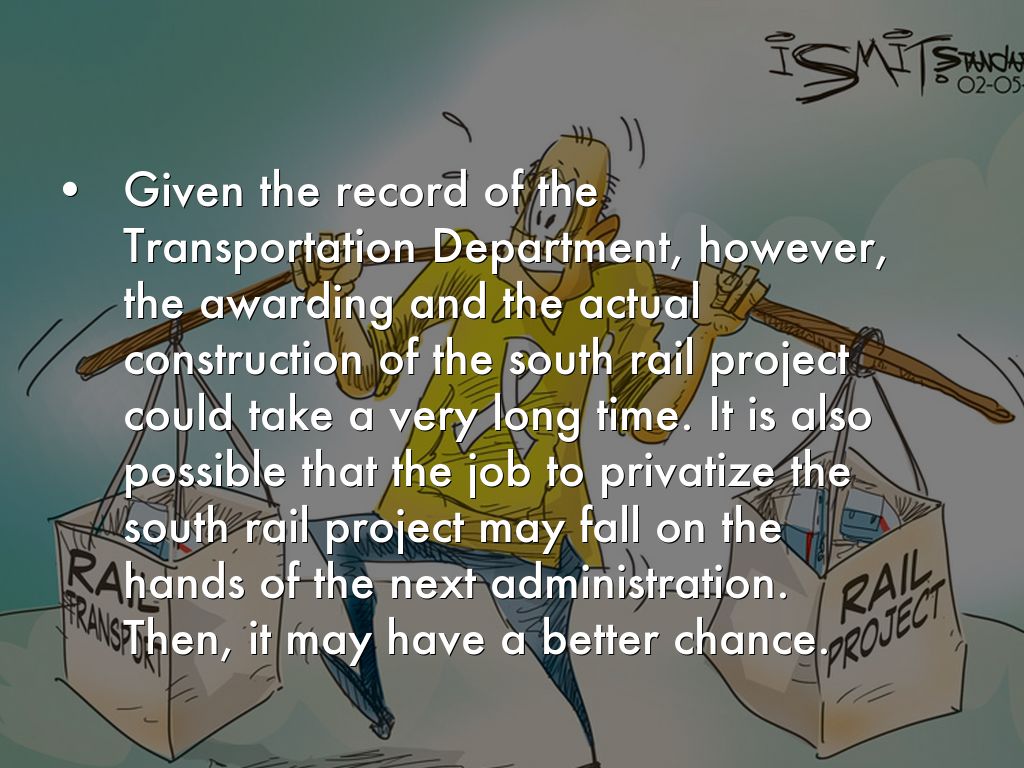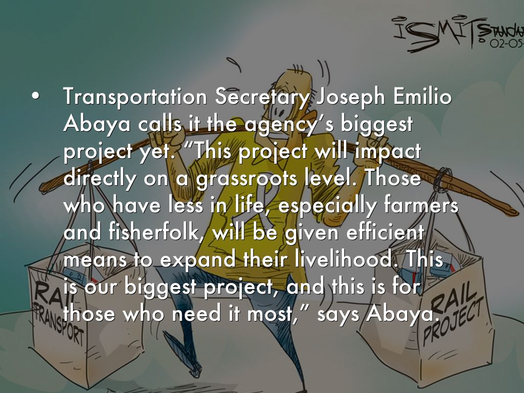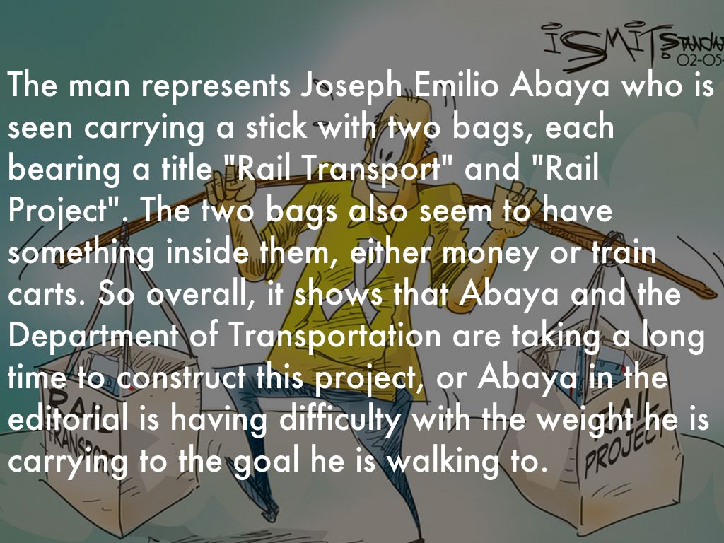 The man represents Joseph Emilio Abaya who is seen carrying a stick with two bags, each bearing a title "Rail Transport" and "Rail Project". The two bags also seem to have something inside them, either money or train carts. So overall, it shows that Abaya and the Department of Transportation are taking a long time to construct this project, or Abaya in the editorial is having difficulty with the weight he is carrying to the goal he is walking to.
