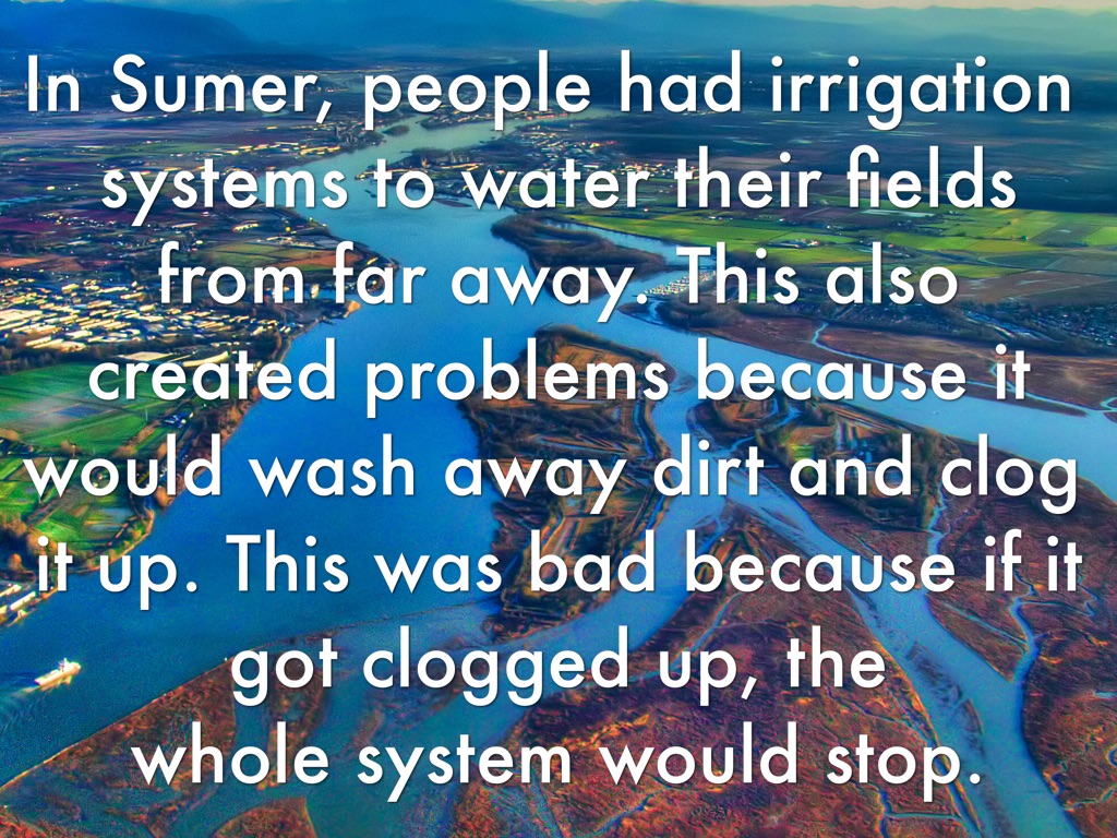 In Sumer, people had irrigation systems to water their fields from far away. This also created problems because it would wash away dirt and clog it up. This was bad because if it got clogged up, the whole system would stop.