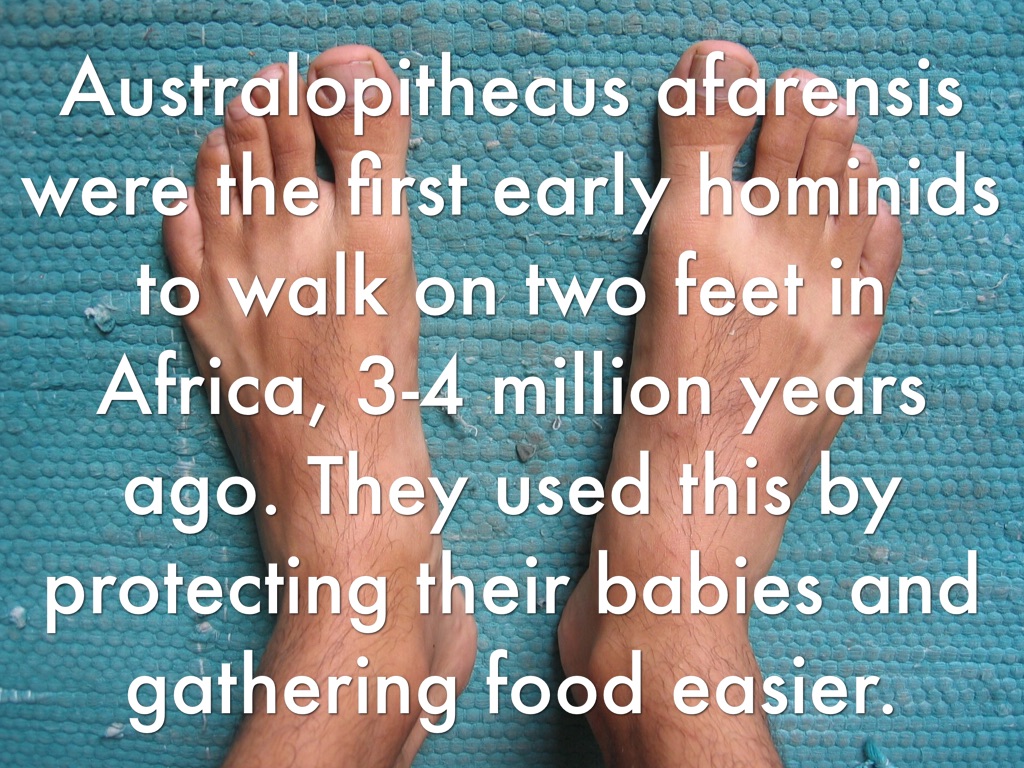 Australopithecus afarensis were the first early hominids to walk on two feet in Africa, 3-4 million years ago. They used this by protecting their babies and gathering food easier.