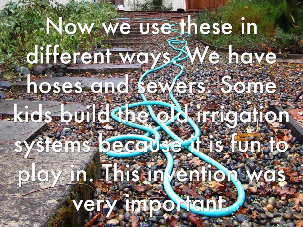 Now we use these in different ways. We have hoses and sewers. Some kids build the old irrigation systems because it is fun to play in. This invention was very important.