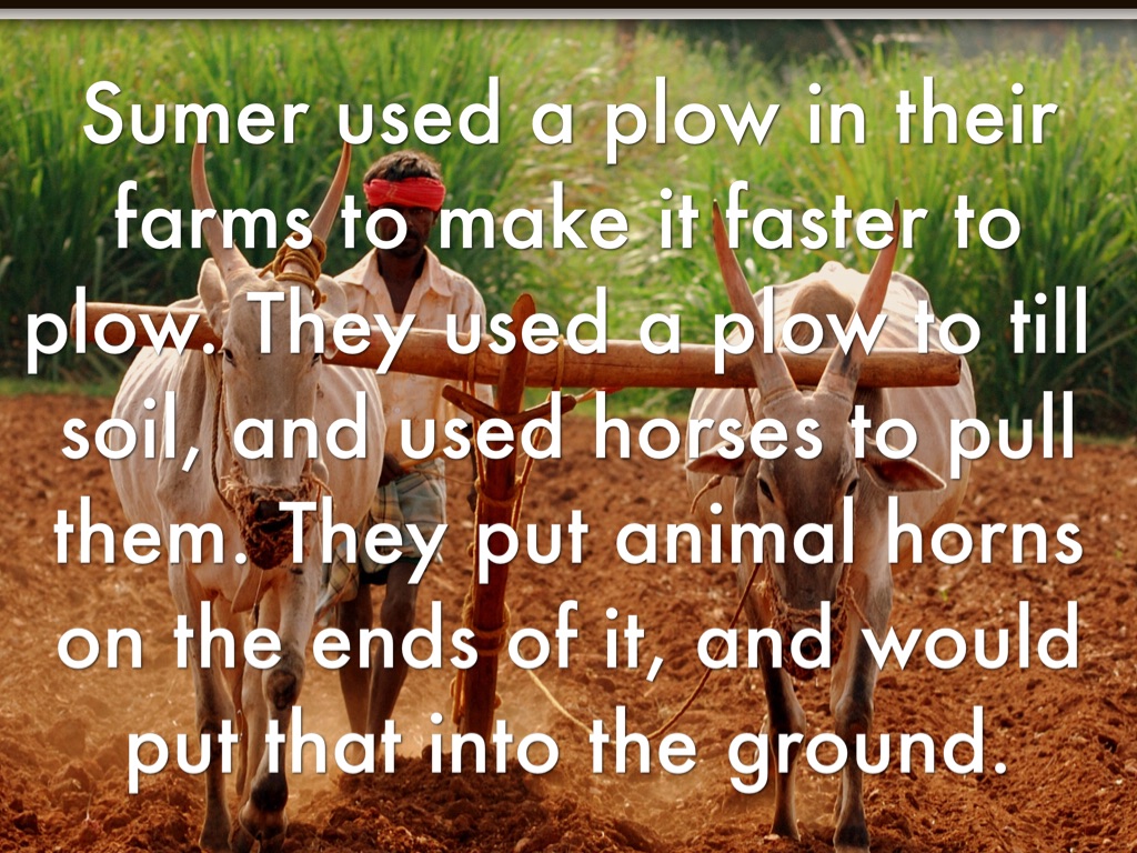 Sumer used a plow in their farms to make it faster to plow. They used a plow to till soil, and used horses to pull them. They put animal horns on the ends of it, and would put that into the ground.