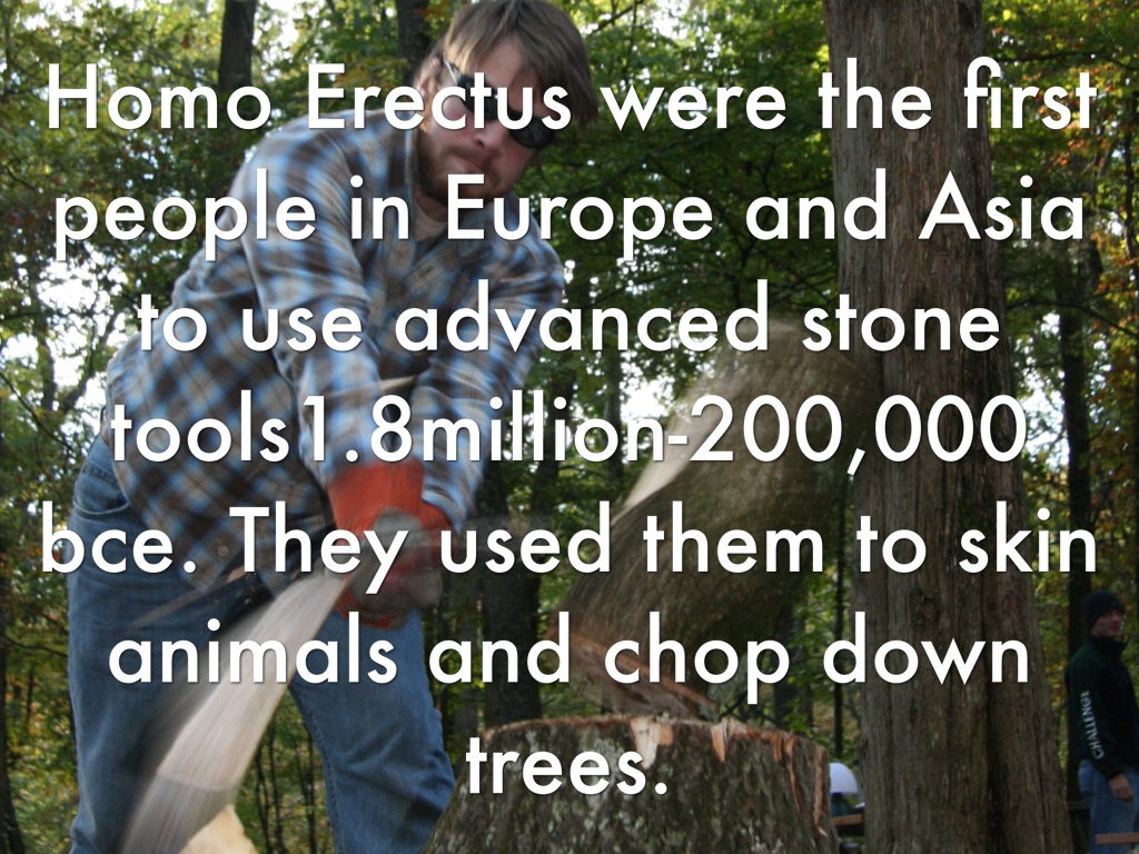Homo Erectus were the first people in Europe and Asia to use advanced stone tools1.8million-200,000 bce. They used them to skin animals and chop down trees.