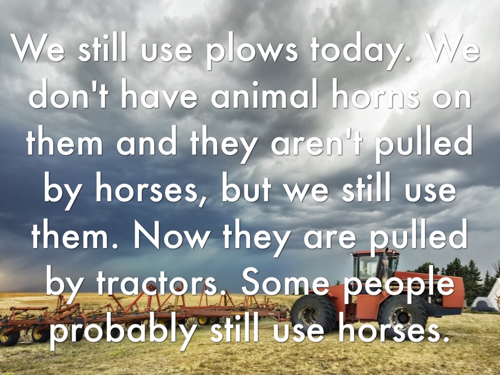 We still use plows today. We don't have animal horns on them and they aren't pulled by horses, but we still use them. Now they are pulled by tractors. Some people probably still use horses.