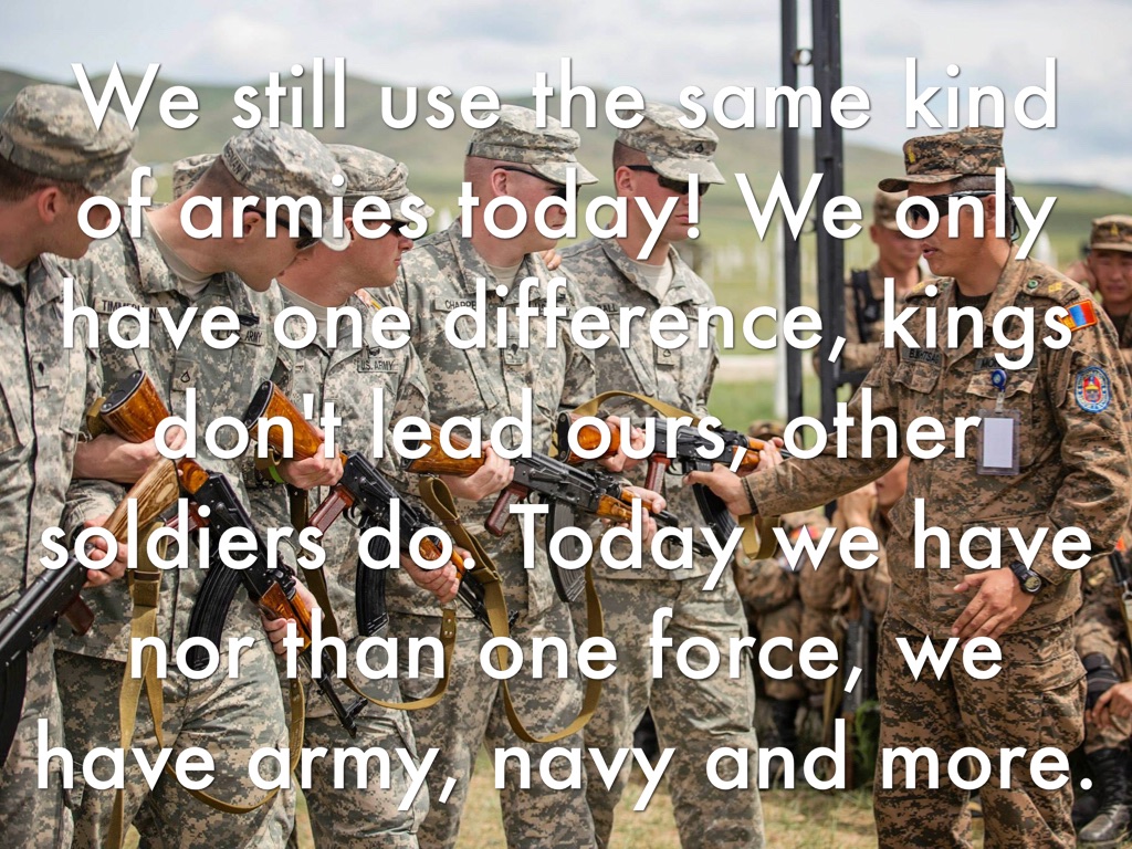 We still use the same kind of armies today! We only have one difference, kings don't lead ours, other soldiers do. Today we have nor than one force, we have army, navy and more.