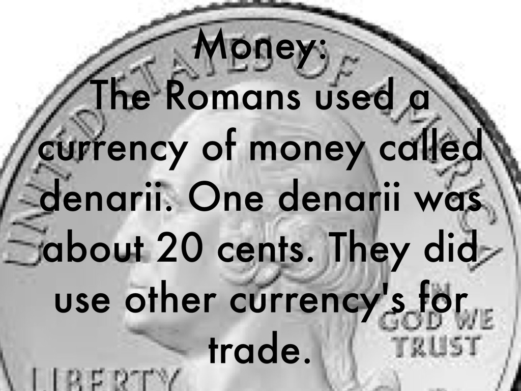 The Romans used a currency of money called denarii. One denarii was about 20 cents. They did use other currency's for trade.