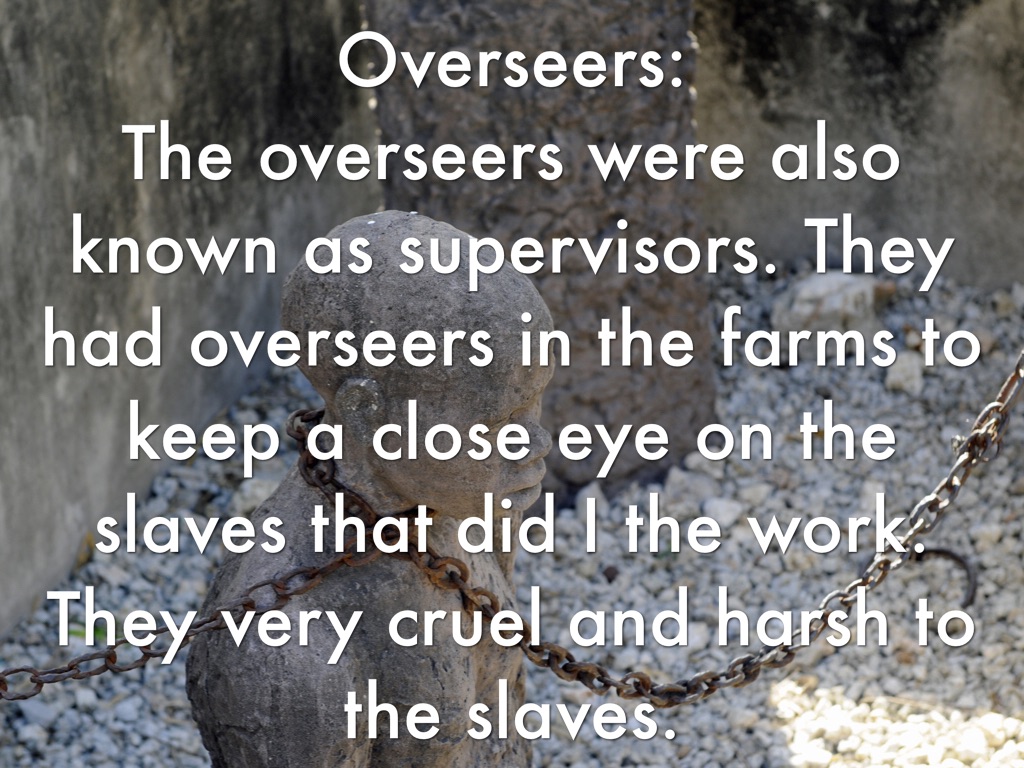 The overseers were also known as supervisors. They had overseers in the farms to keep a close eye on the slaves that did I the work. They very cruel and harsh to the slaves.