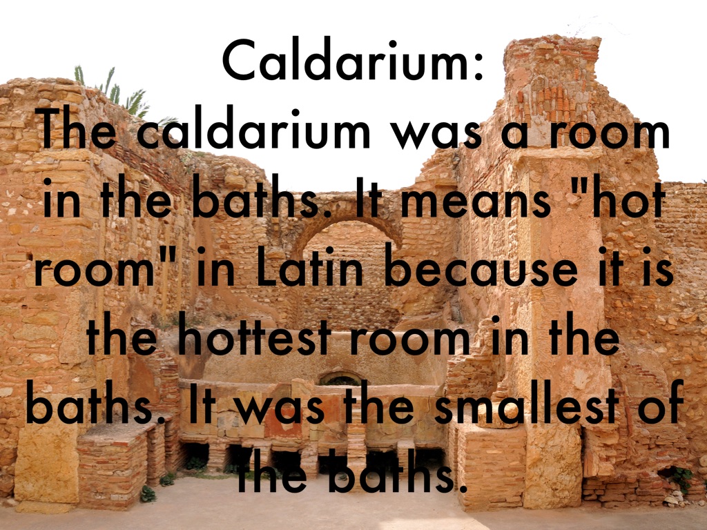 The caldarium was a room in the baths. It means "hot room" in Latin because it is the hottest room in the baths. It was the smallest of the baths.