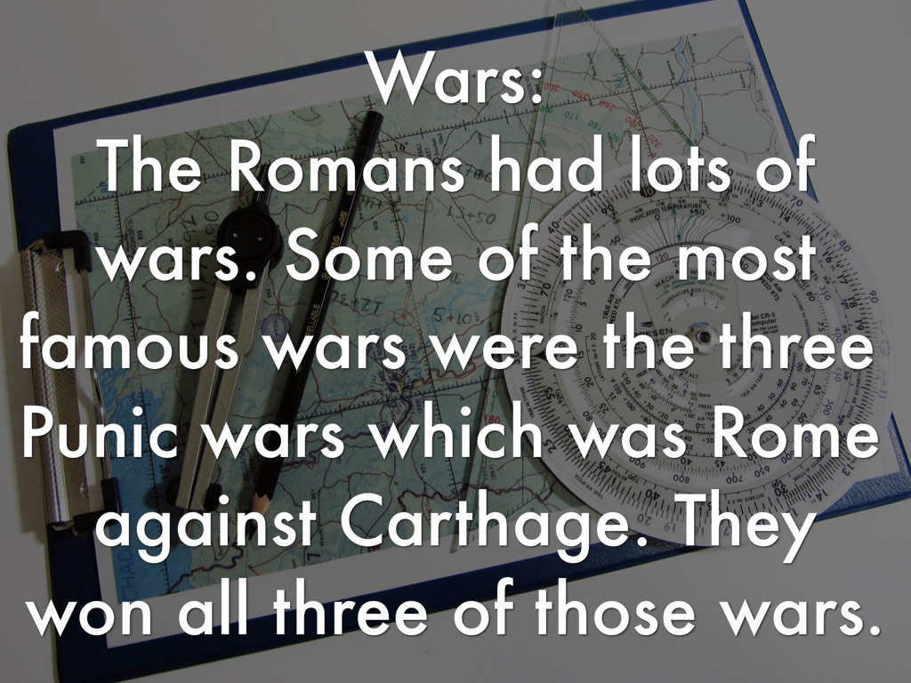 The Romans had lots of wars. Some of the most famous wars were the three Punic wars which was Rome against Carthage. They won all three of those wars.