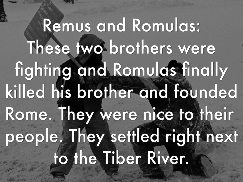 These two brothers were fighting and Romulas finally killed his brother and founded Rome. They were nice to their people. They settled right next to the Tiber River.