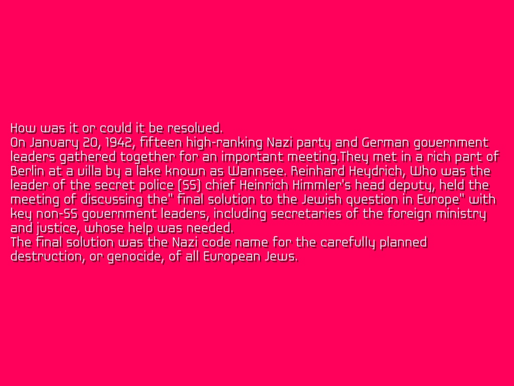 On January 20, 1942, fifteen high-ranking Nazi party and German government leaders gathered together for an important meeting.They met in a rich part of Berlin at a villa by a lake known as Wannsee. Reinhard Heydrich, Who was the leader of the secret police (SS) chief Heinrich Himmler's head deputy, held the meeting of discussing the" final solution to the Jewish question in Europe" with key non-SS government leaders, including secretaries of the foreign ministry and justice, whose help was needed.