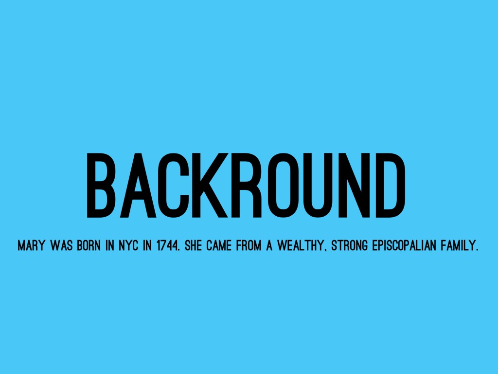 MARY WAS BORN IN NYC IN 1744. SHE CAME FROM A WEALTHY, STRONG EPISCOPALIAN FAMILY.