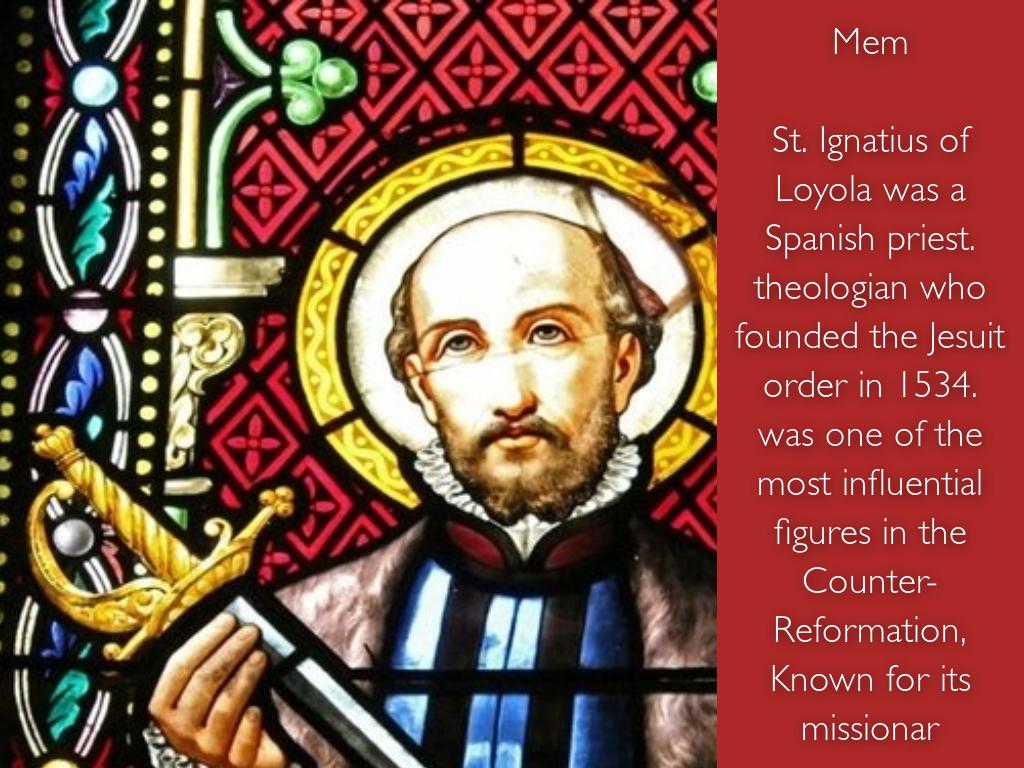 St. Ignatius of Loyola was a Spanish priest. theologian who founded the Jesuit order in 1534. was one of the most influential figures in the Counter-Reformation, Known for its missionar
