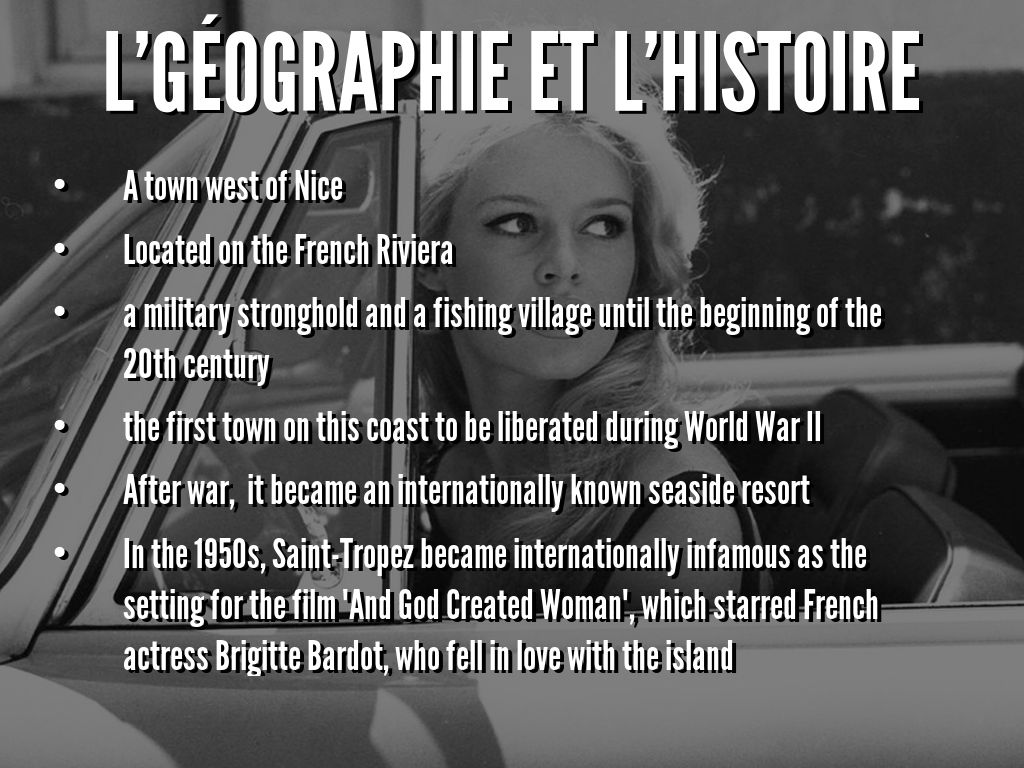 - In the 1950s, Saint-Tropez became internationally infamous as the setting for the film "And God Created Woman", which starred French actress Brigitte Bardot, who fell in love with the island