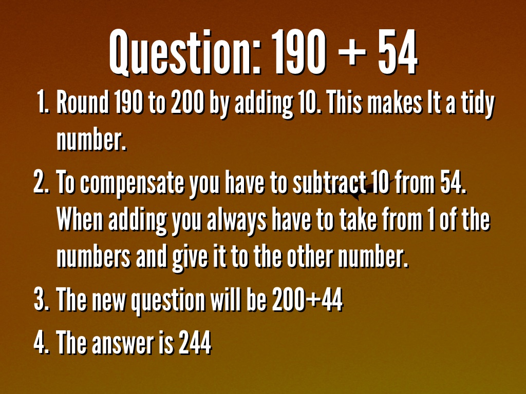 Round 190 to 200 by adding 10. This makes It a tidy number.