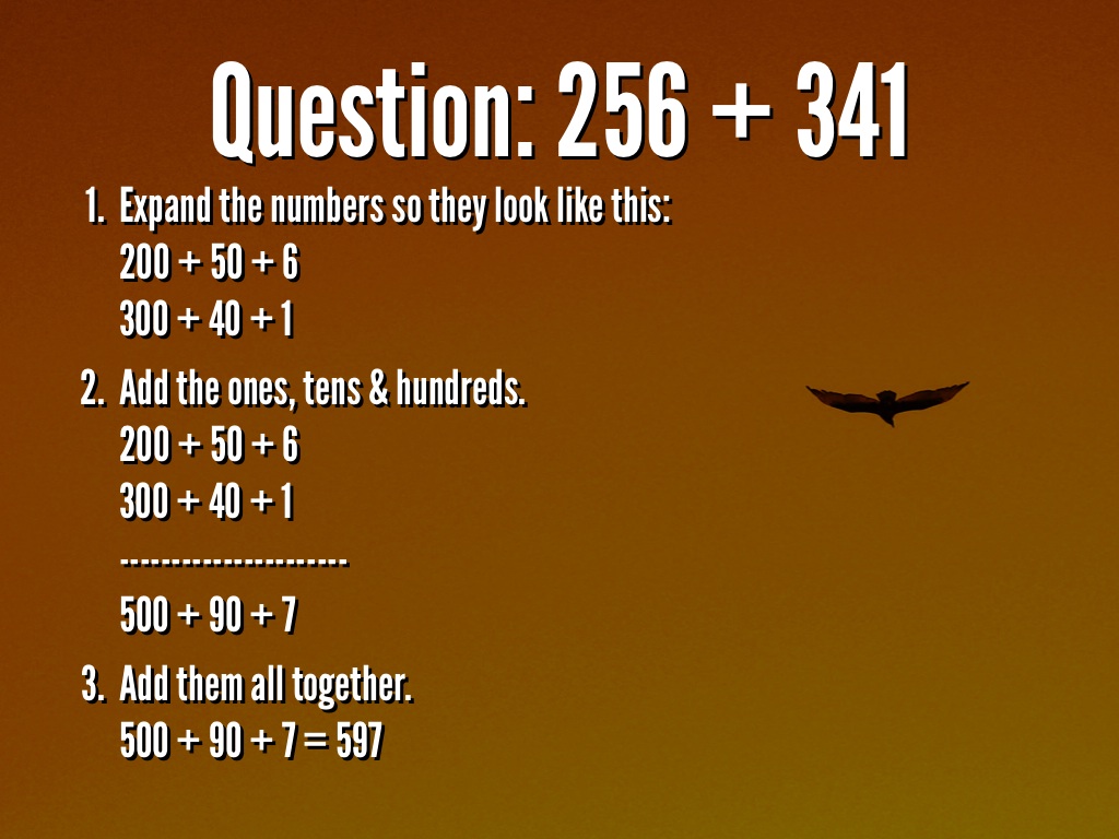 Add the ones, tens & hundreds. 200 + 50 + 6 300 + 40 + 1 ---------------------- 500 + 90 + 7