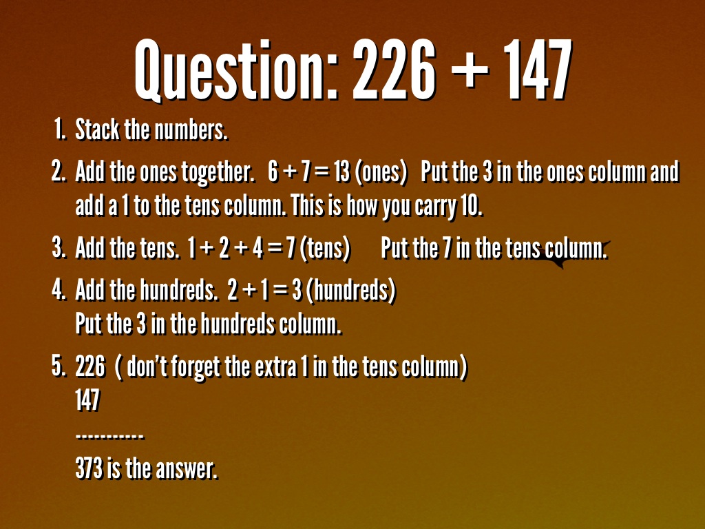226 ( don't forget the extra 1 in the tens column) 147 ----------- 373 is the answer.