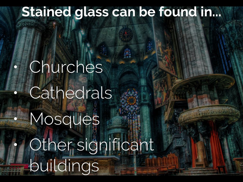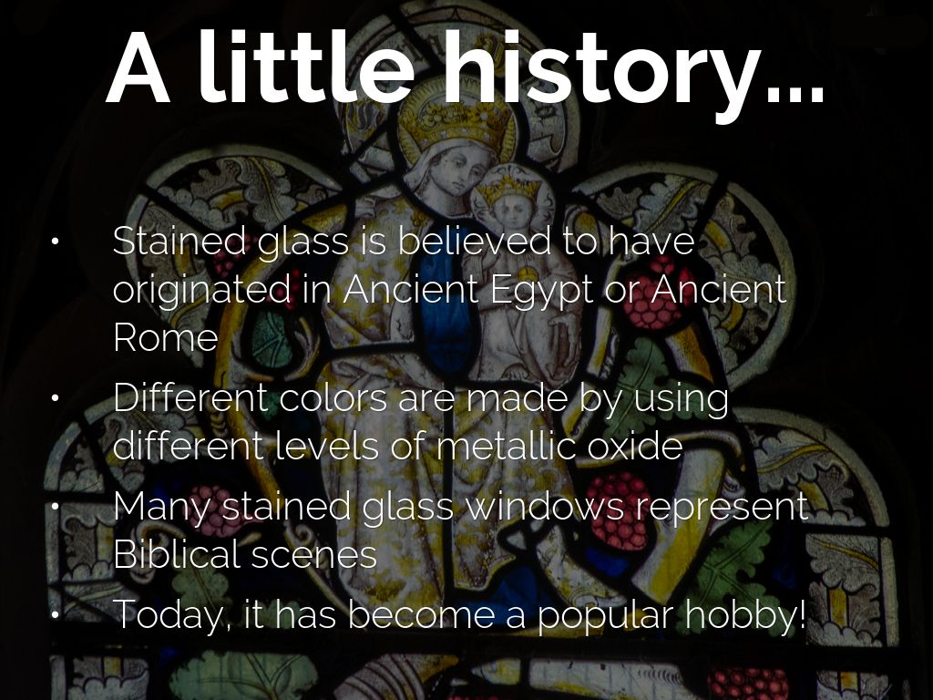 • Stained glass is believed to have originated in Ancient Egypt or Ancient Rome