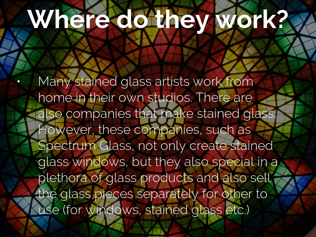 • Many stained glass artists work from home in their own studios. There are also companies that make stained glass. However, these companies, such as Spectrum Glass, not only create stained glass windows, but they also special in a plethora of glass products and also sell the glass pieces separately for other to use (for windows, stained glass etc.)