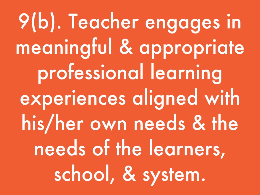 9(b). Teacher engages in meaningful & appropriate professional learning experiences aligned with his/her own needs & the needs of the learners, school, & system.