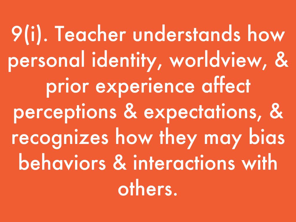 9(i). Teacher understands how personal identity, worldview, & prior experience affect perceptions & expectations, & recognizes how they may bias behaviors & interactions with others.