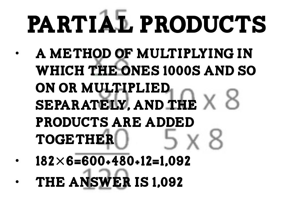 A method of multiplying in which the ones 1000s and so on or multiplied separately, and the products are added together