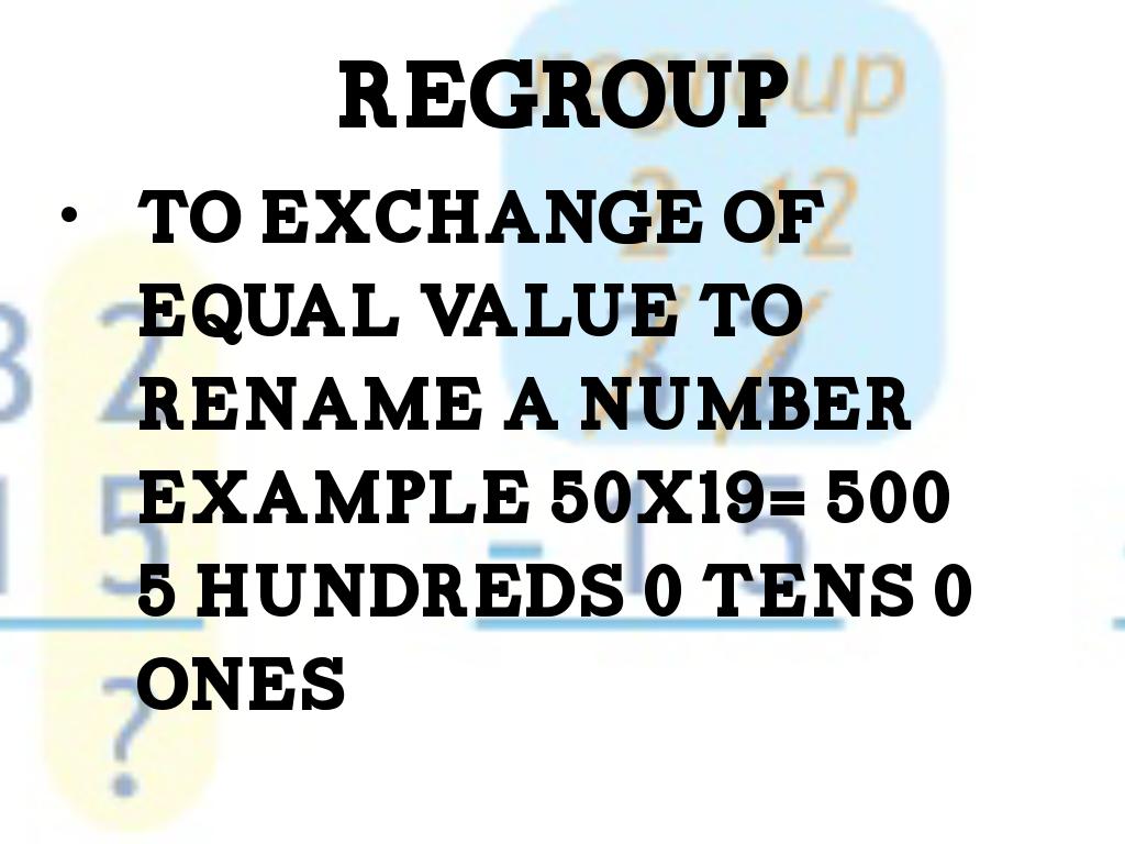 To exchange of equal value to rename a number example 50x19= 500 5 hundreds 0 tens 0 ones