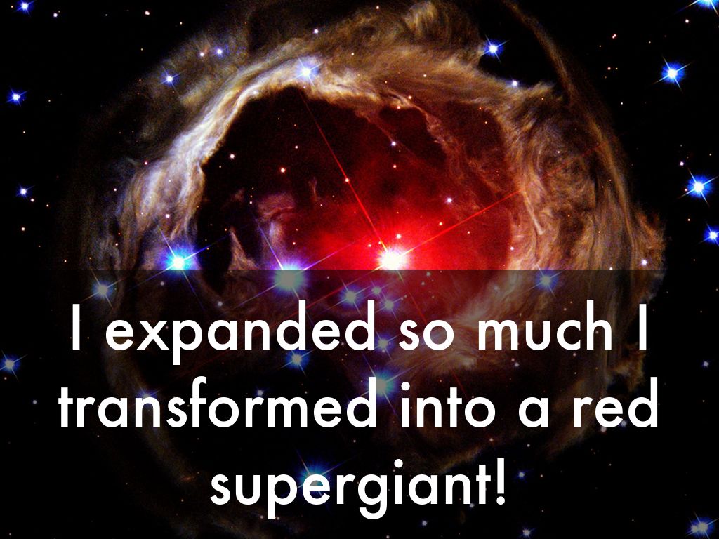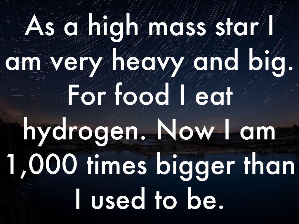 As a high mass star I am very heavy and big. For food I eat hydrogen. Now I am 1,000 times bigger than I used to be.