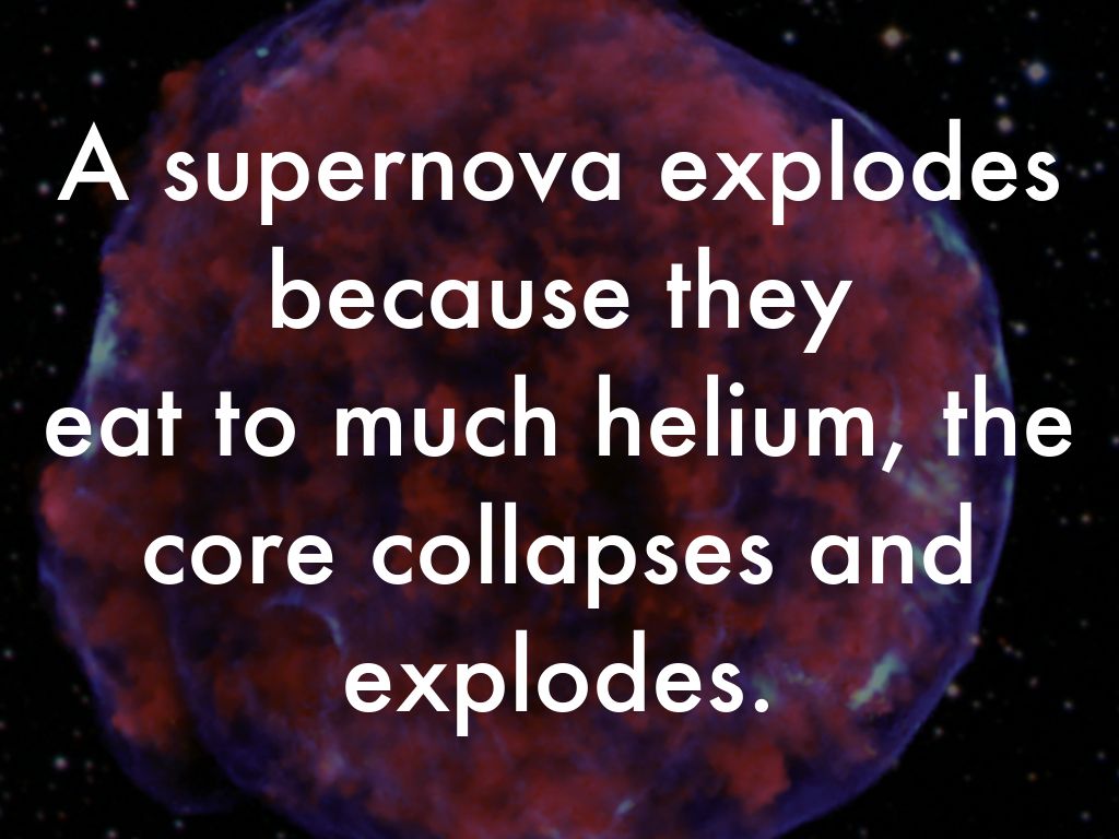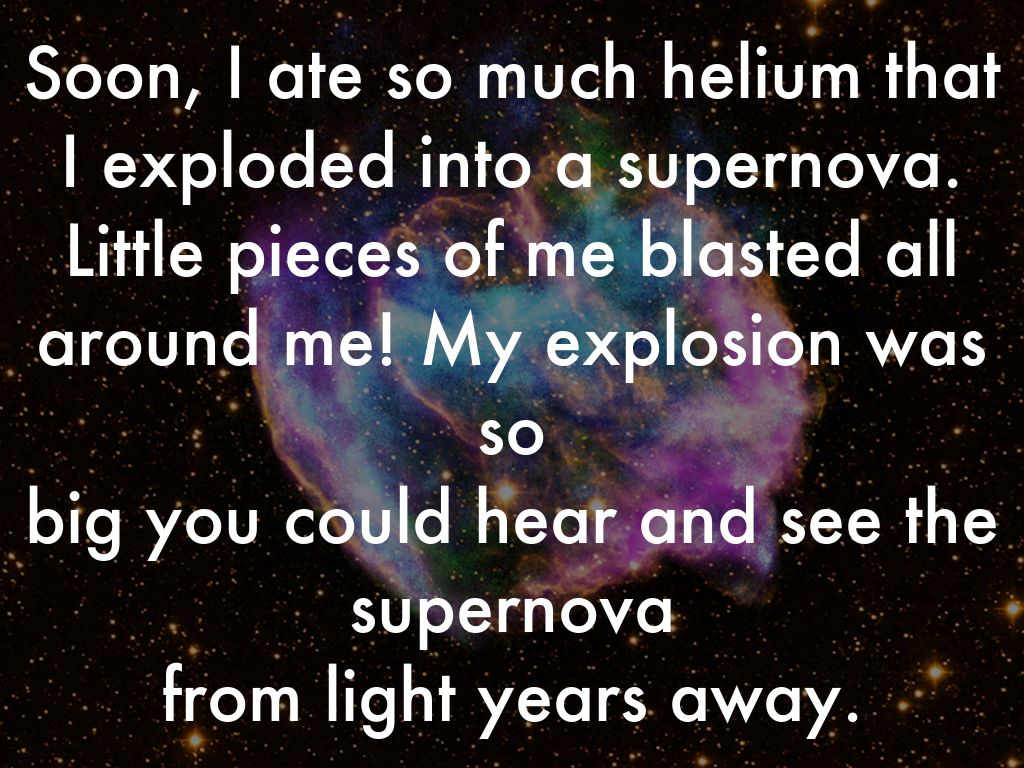 Soon, I ate so much helium that I exploded into a supernova. Little pieces of me blasted all around me! My explosion was so